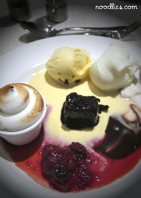 KLui’s Dessert Medley – custard with alaska top, lime and chilli ice-cream and yoghurt sorbert (I love the combination of the light sour flavour and the little tingle feeling to the tongue from the chilli), chocolate pudding in custard topping, berry mix and chocolate sauce.
