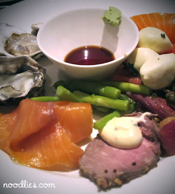Smoke Salmon, Sydney Rock Oysters in mini version, Salmon Sushi, Mushroom and Onion Salad, Tomato and Buffalo Mozzarella Salad, Roast Beef with Aioli.