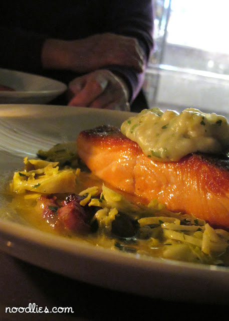Salmon belly with spanner crab brandade, warm pancetta and sprout salad, lemon butter: the fish was 40% cooked, leaving the fish with a soft texture. Great for fish lovers!