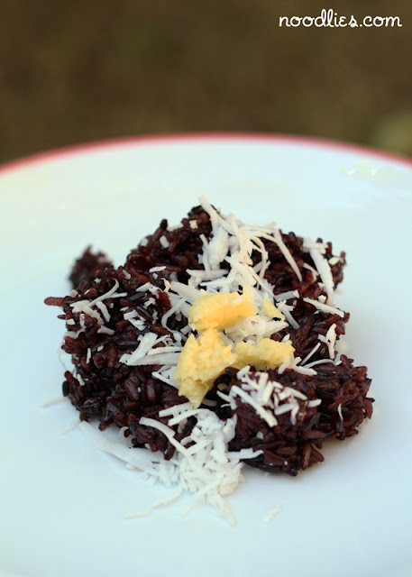 This is another sticky rice desserts, this one is relatively simple, purple coloured sticky rice, served warm and sprinkled with shredded coconut and sweet soya bean paste. You can also add sugar and a little salt to taste, or I’ve seen people pour coconut milk over the dessert as well.