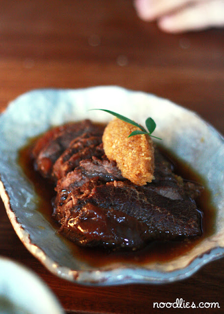 The dark ceramic bowls and plates showcase rather than compete with their content. The food is subtle, meat is marinated with a light touch. This is probably best demonstrated by the duck which is lightly marinated and perfectly cooked, a little crispy on the outside, moist and tender inside. The marinated nashi pear on the side is tasty but subtle.