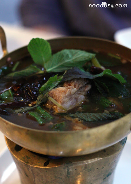 Our next dish was a fish tom yum, that came in a great brass container heated by heat beads. Again, soft, light flavours.