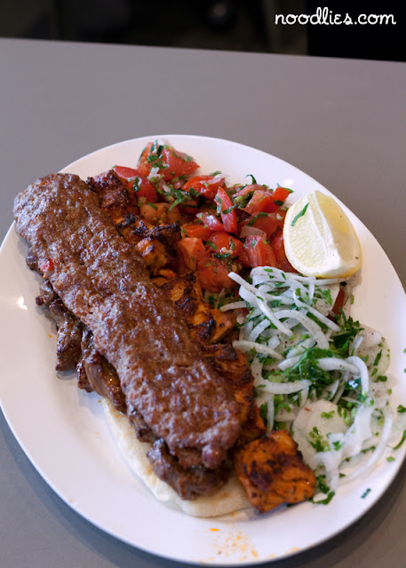 I’m in a hungry mood tonight and went for the mixed plate shish kebab, consisting of chicken and two types of lamb, minced and cubed. It comes with fresh tomato salad, onions and wonderful flat bread that’s been ever so lightly toasted.
